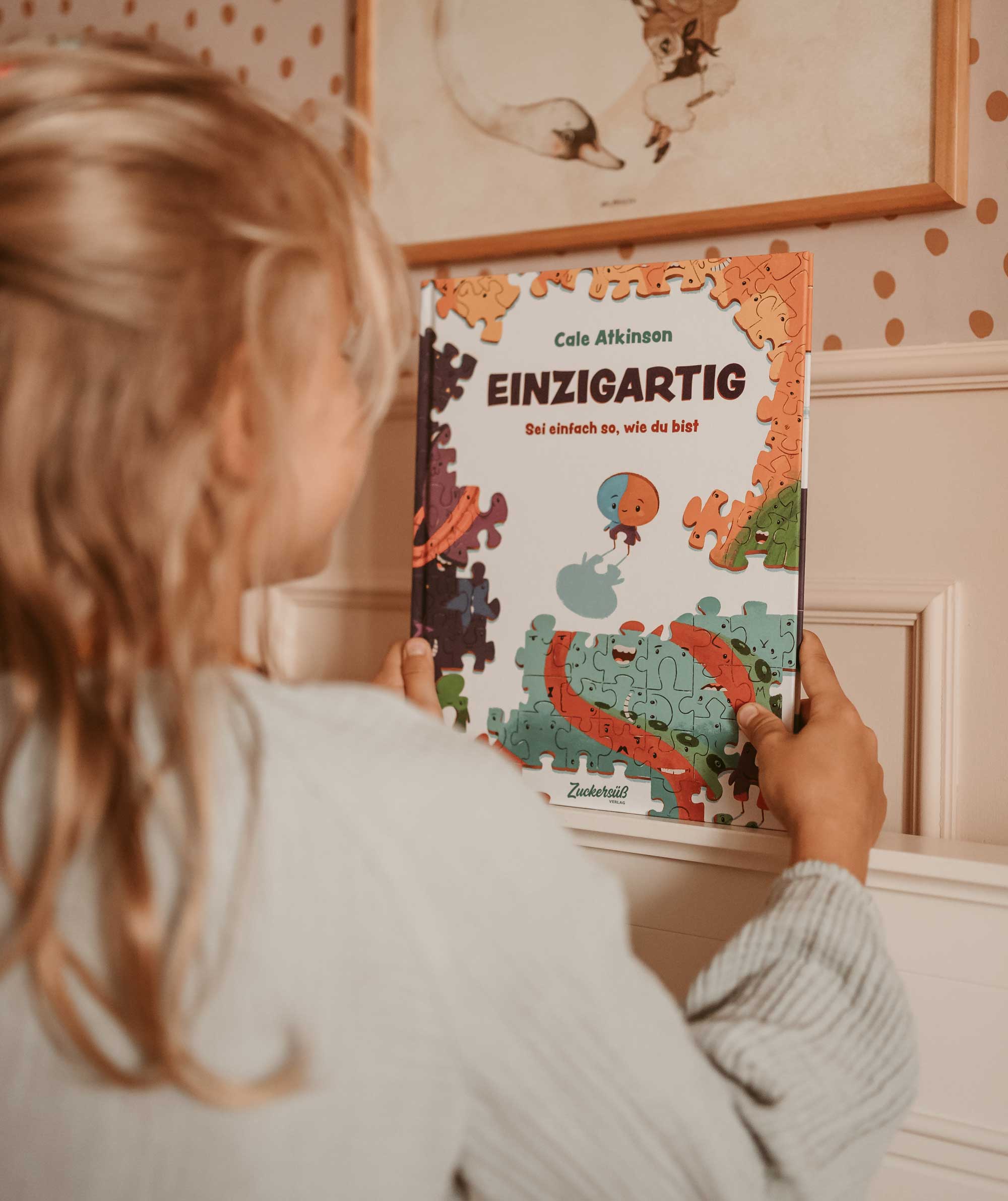 In „Einzigartig“ von Cale Atkinson träumt das kleine Puzzleteilchen Oliver vom ganz großen Abenteuer: Passt er in die riesigen Tentakeln eines Piratentintenfisches? Oder gehört er zum fantastischen Einhorn im funkelnden Weltall? Doch wo er auch hinkommt, fühlt er sich fehl am Platz. Zu klein, zu bunt, zu rund! Oliver verbiegt und verstellt sich, bis die anderen Teile ihn endlich aufnehmen. Doch was ist schön daran, dazuzugehören, wenn er nicht so sein darf, wie er ist?